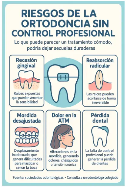 Mover dientes sin una evaluación periodontal previa puede provocar lesiones graves en los tejidos de soporte. Las fuerzas aplicadas por los alineadores caseros pueden concentrarse en zonas inadecuadas, generando recesión gingival, inflamación o pérdida de hueso alveolar (COEM, 2023). En la práctica, esto se traduce en dientes que parecen más largos o en movilidad dental.